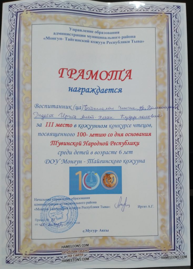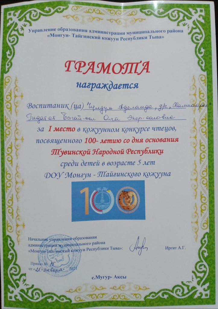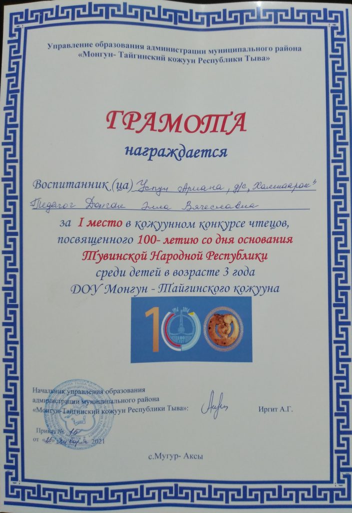 22 января 2021г., на основании годового плана Управления образования администрации муниципального района «Монгун-Тайгинский кожуун Республики Тыва» был проведен конкурс чтецов среди воспитанников ДОУ Монгун-Тайгинского кожууна «Мы дети Тувы!» посвященный к 100 – летию со дня образования Тувинской Народной Республики.