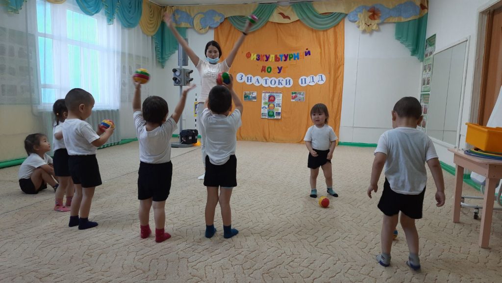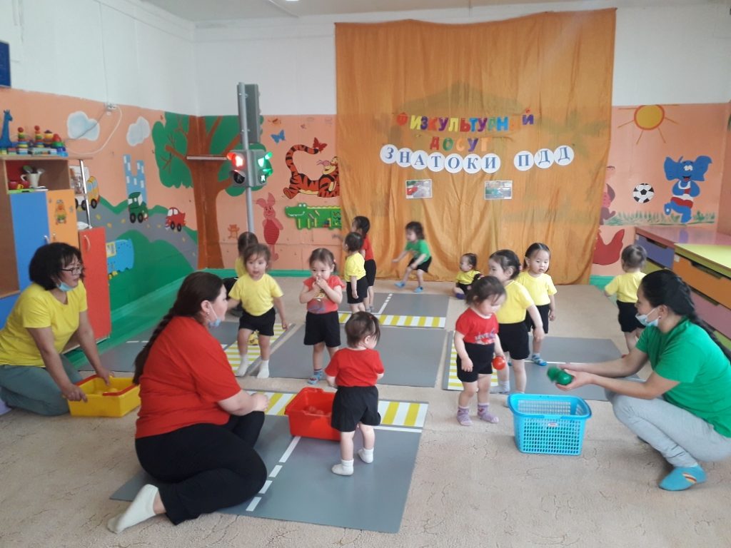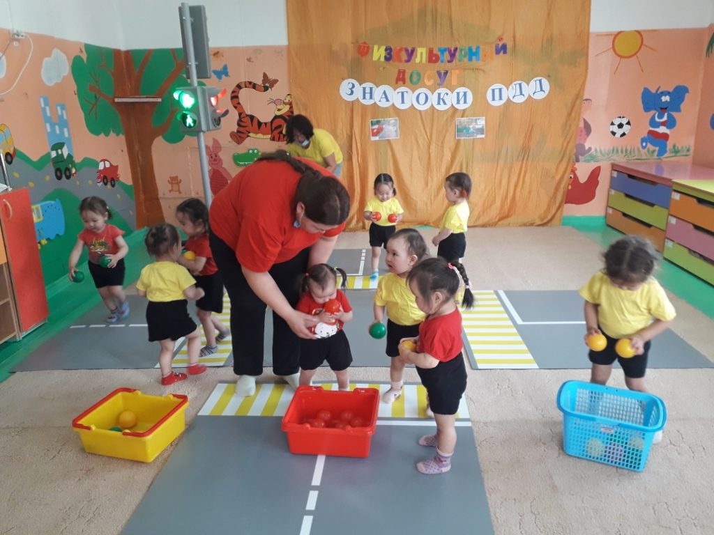 Воспитанники младших групп играли в различные развивающие игры: «Собери мячики по цвету», «Три цвета светофора»…..