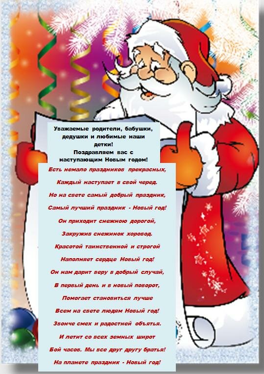 Уважаемые родители! Мы, всем коллективом нашего любимого детского сада, желаем здоровья вам и вашим деткам. Мы желаем, чтобы никакие жизненные невзгоды не помешали вам каждый день приходить в наш уютный и светлый дом, где ваших деток любят, ценят и готовы отдавать им все тепло своих сердец. Желаем, чтобы этот год был для вас успешным и удачным, чтобы вы смогли достичь всего того, к чему вы стремитесь и чтобы вы могли гордиться своими успехами так же, как вы гордитесь своими малышами. С Новым годом!