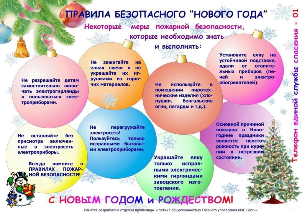 Не обкладывайте подставку ёлки ватой. Освещать ёлку следует только электрогирляндами промышленного производства. В помещении не разрешается зажигать бенгальские огни, применять хлопушки и восковые свечи. Помните, открытый огонь всегда опасен! Не следует использовать пиротехнику, если вы не понимаете как ею пользоваться, а инструкции не прилагается, или она написана на непонятном вам языке. Нельзя ремонтировать и вторично использовать не сработавшую пиротехнику. Категорически запрещается применять самодельные пиротехнические устройства. Запрещено: устраивать “салюты” ближе 30 метров от жилых домов и легковоспламеняющихся предметов, под низкими навесами и кронами деревьев. носить пиротехнику в карманах. держать фитиль во время зажигания около лица. использовать пиротехнику при сильном ветре. направлять ракеты и фейерверки на людей. бросать петарды под ноги. низко нагибаться над зажженными фейерверками. находиться ближе 15 метров от зажженных пиротехнических изделий. Бенгальские огни, фейерверки, свечи – все эти непременные атрибуты новогоднего праздника могут принести не только радость, но и беду. Особенно это касается новогодних елок в школах, детских садах, лечебных и других учреждениях. А чтобы праздник не привел к трагедии, достаточно соблюдать несложные правила. Помещение, где проводятся массовые новогодние мероприятия, должно быть расположено на первом или втором этаже (не выше) и иметь два выхода. В доступном месте нужно подготовить первичные средства пожаротушения (огнетушители, кошму и др.). Елку ставят на устойчивую подставку, в стороне от выходов и приборов отопления так, чтобы ветки не касались штор, занавесок и других горючих материалов и предметов. Для ее украшения разрешено использовать электрогирлянды только заводского изготовления.