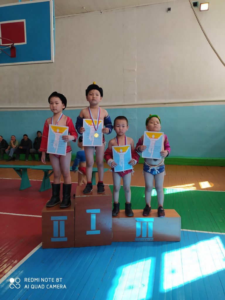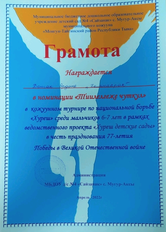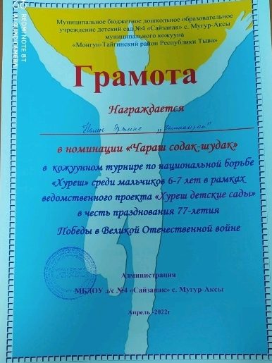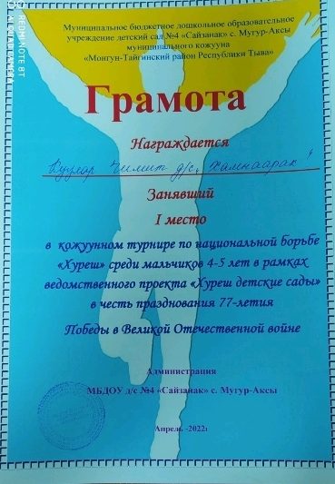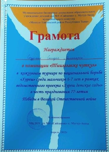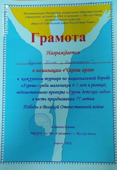 В рамках объявленному месячнику по реализации ведомственного проекта «Хуреш в детские сады» и честь празднования 77-летия Победы в Великой Отечественной войне проведен турнир по национальной борьбе Хуреш среди мальчиков (от 4-7лет) детских садов кожууна. Из нашего детского сада тоже приняли участие мальчики в возрасте 4-6 лет. В итоге Чимит Куулар занял 1 место среди мальчиков в возрасте 4-5 лет. Лучшие звания получили следующие борьцы: