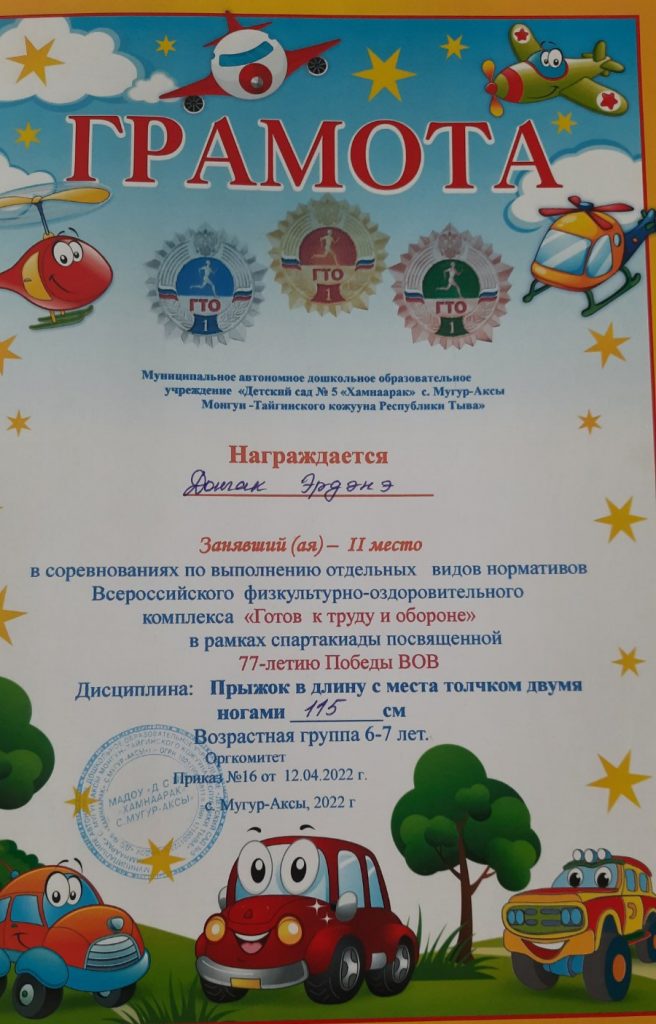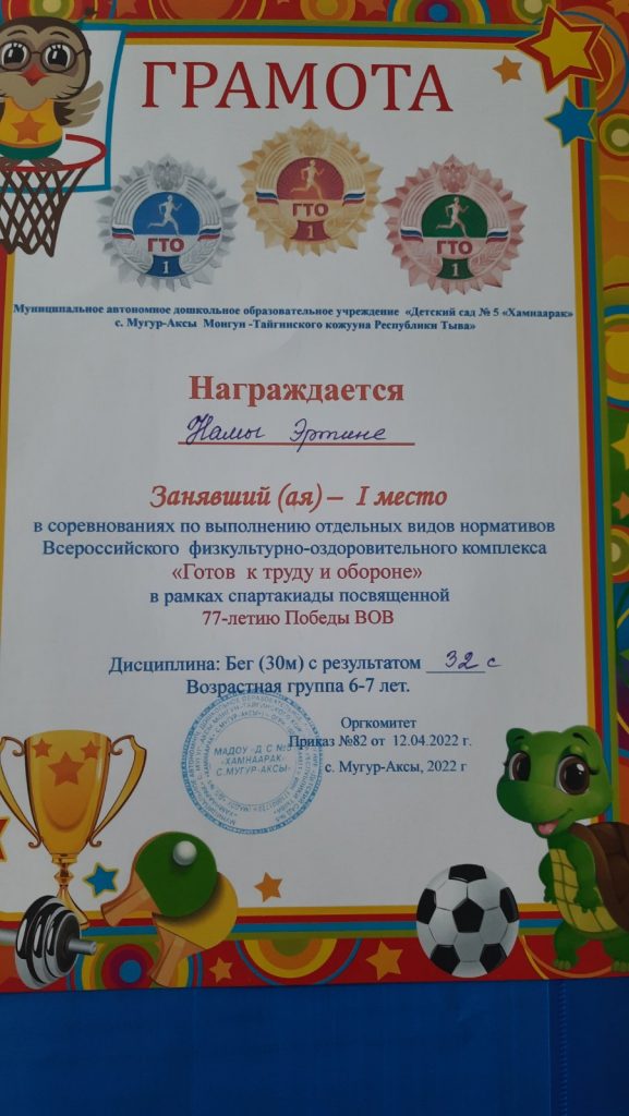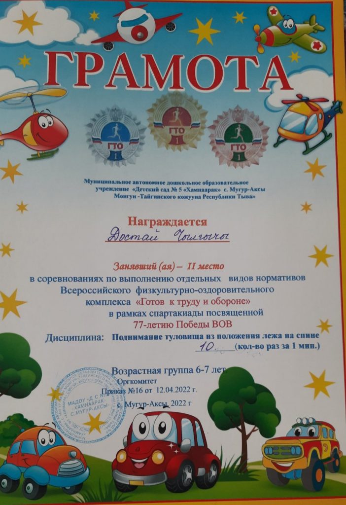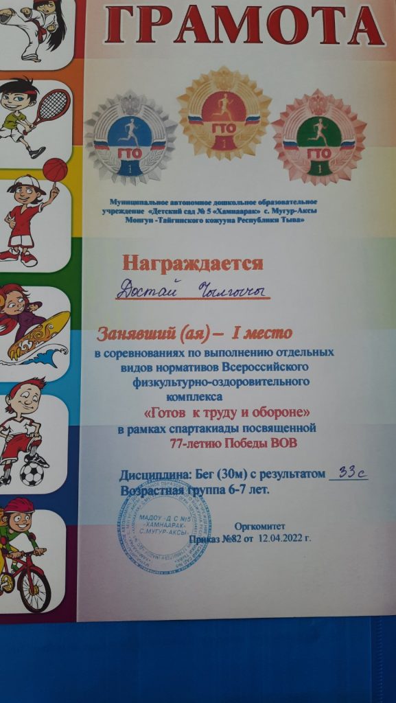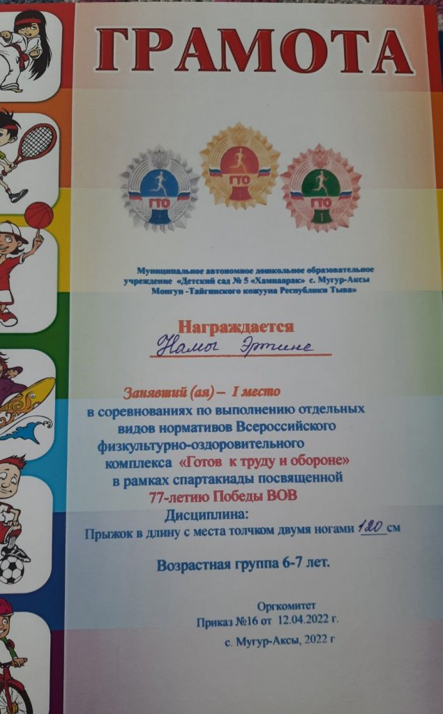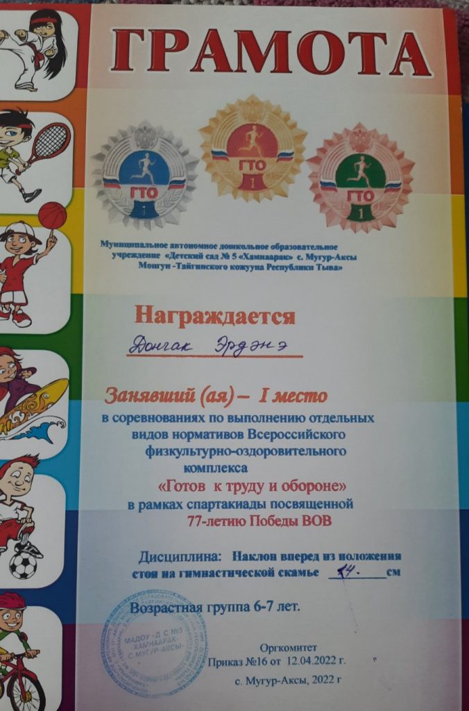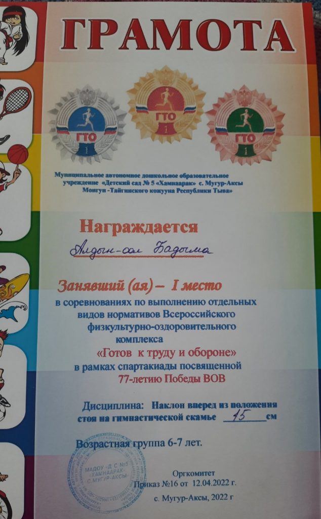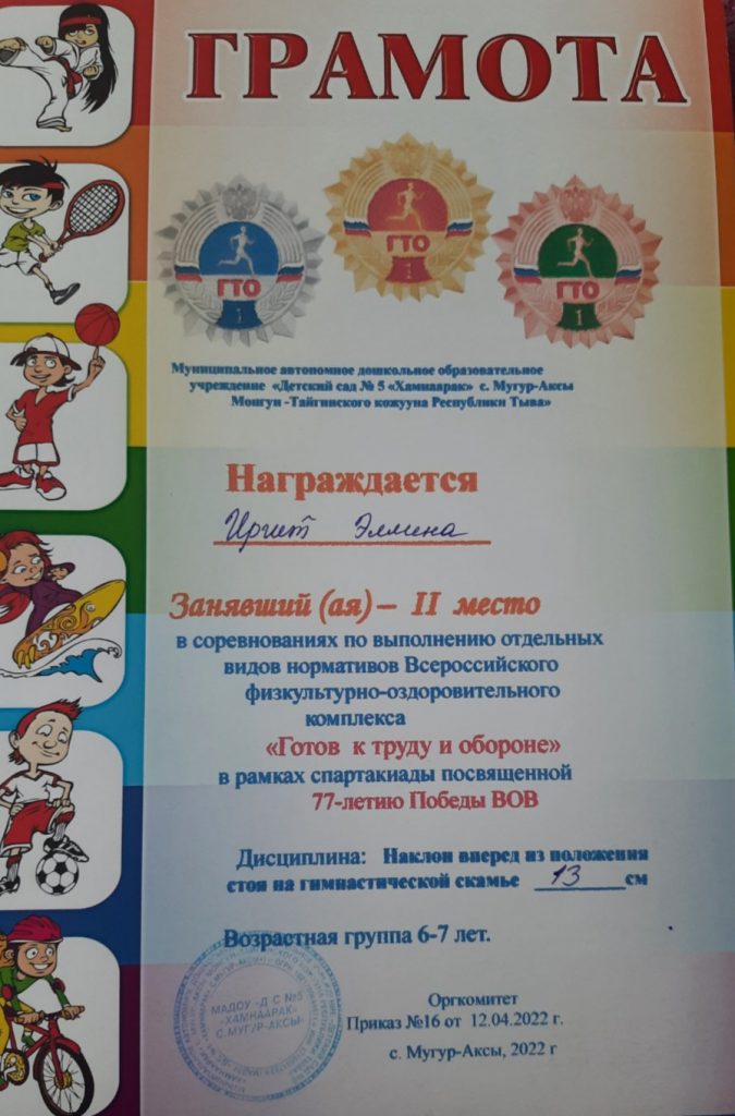 Без рубрики ГТО для дошкольников 07.05.2022 / 5 мая воспитанники старших групп прошли соревнования по выполнению отдельных видов нормативов Всероссийского физкультурно-оздоровительного комплекса «Готов к труду и обороне» в рамках спартакиады посвященной 77-летию Победы ВОВ.