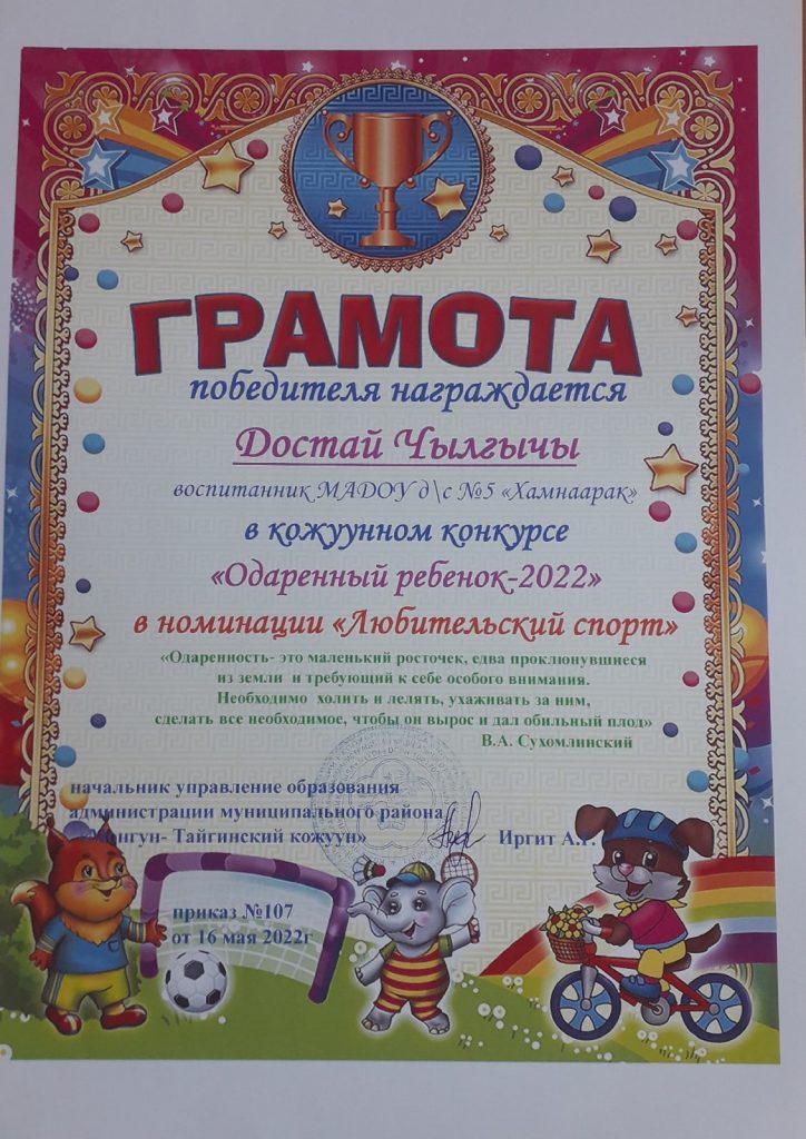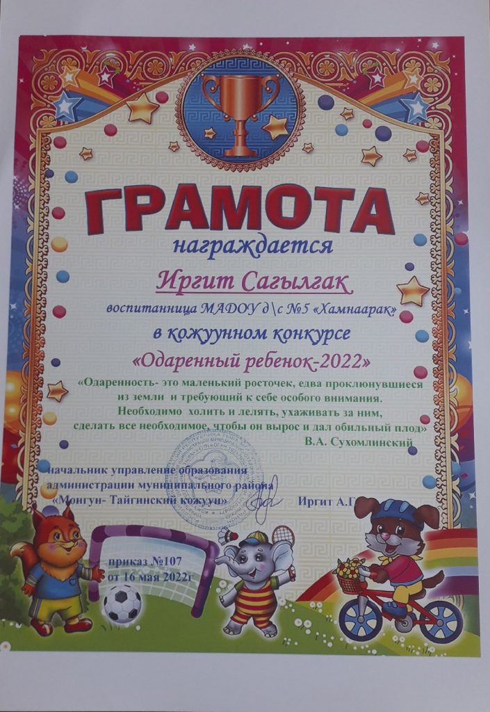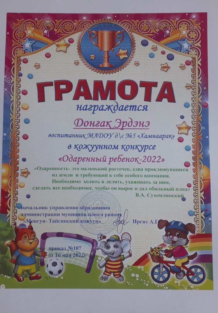 Без рубрики Поздравляем!! 27.05.2022 / Победителями муниципального конкурса»Одаренный ребенок- 2022″ стали воспитанники подготовительной группы:Донгак ЭрдэнэДостай ЧылгычыИргит СагылгакПоздравляем наших выпускниковЖелаем дальнейших успехов в школеДостигать любых высот!!!