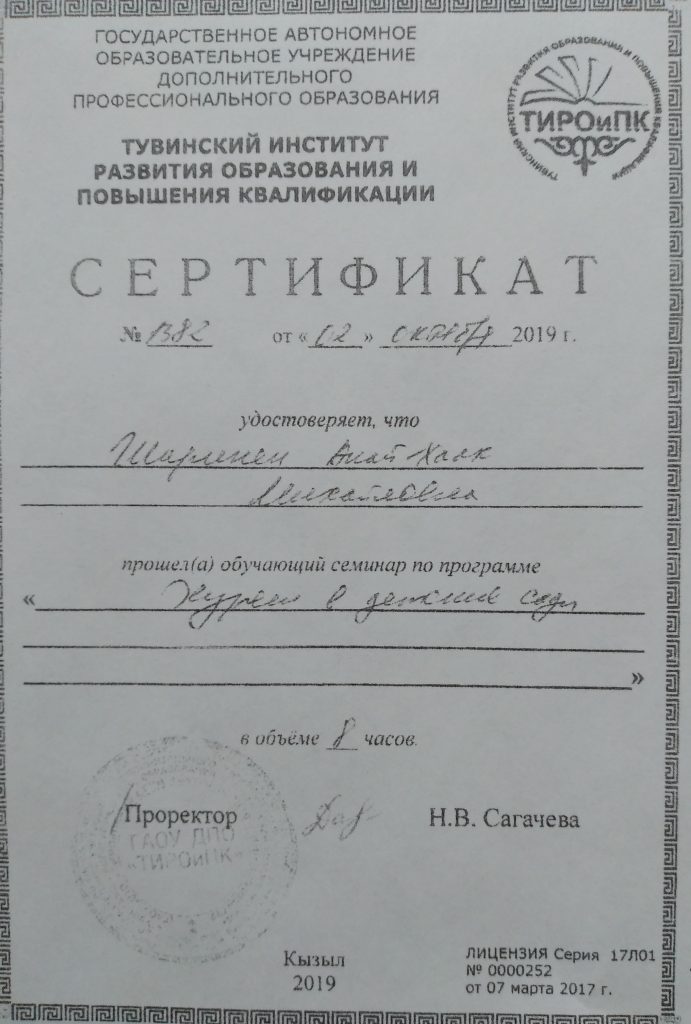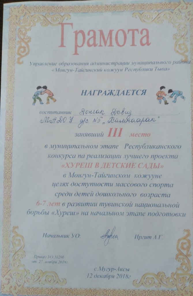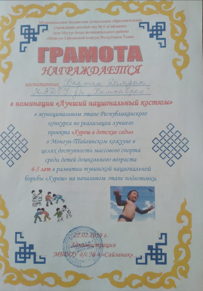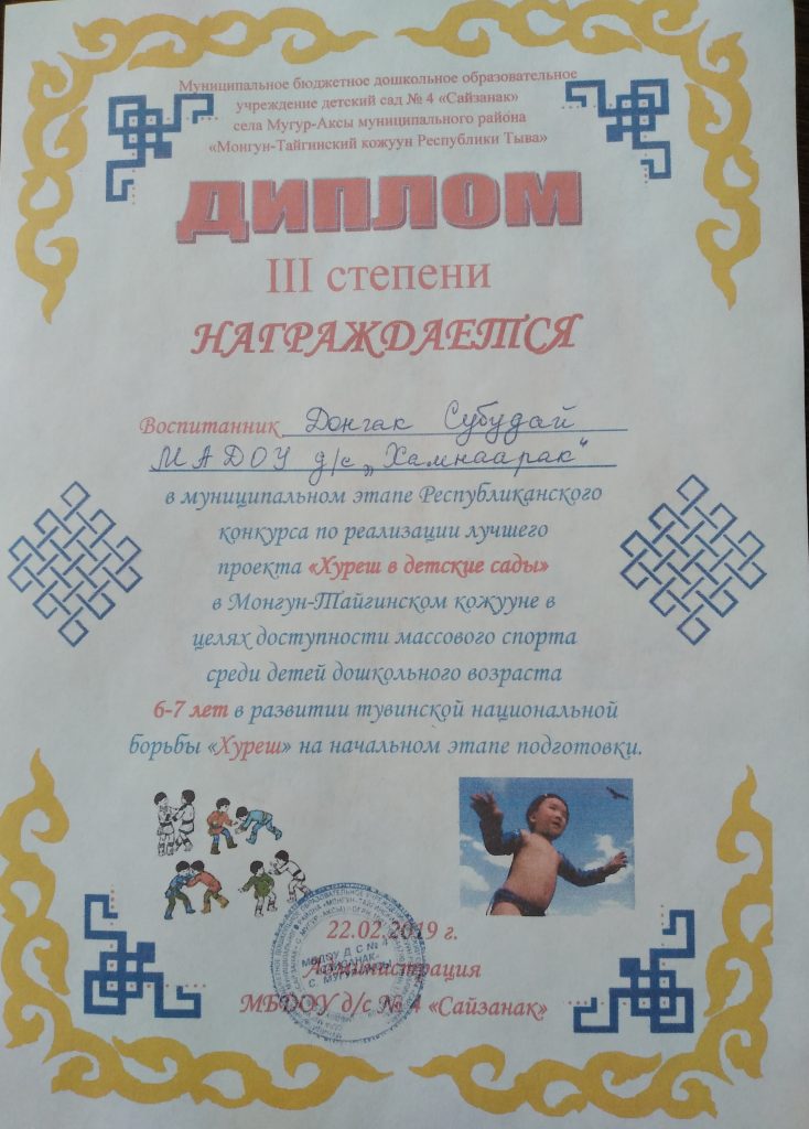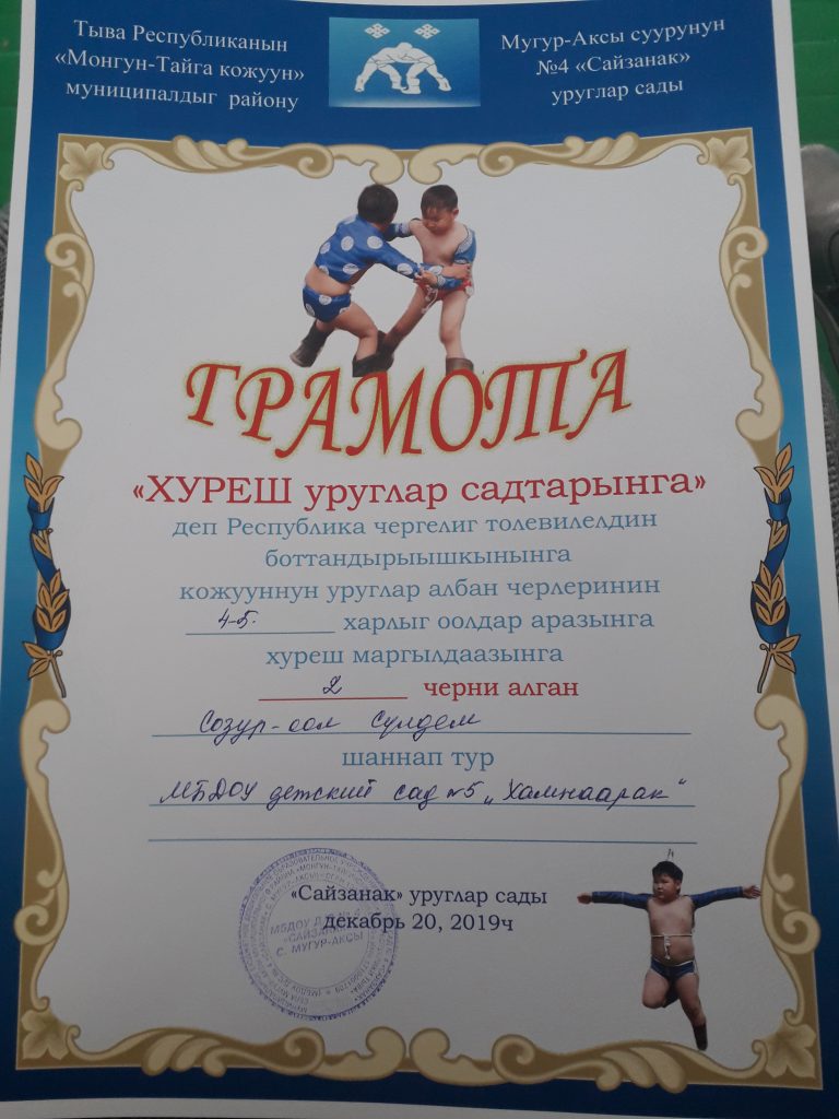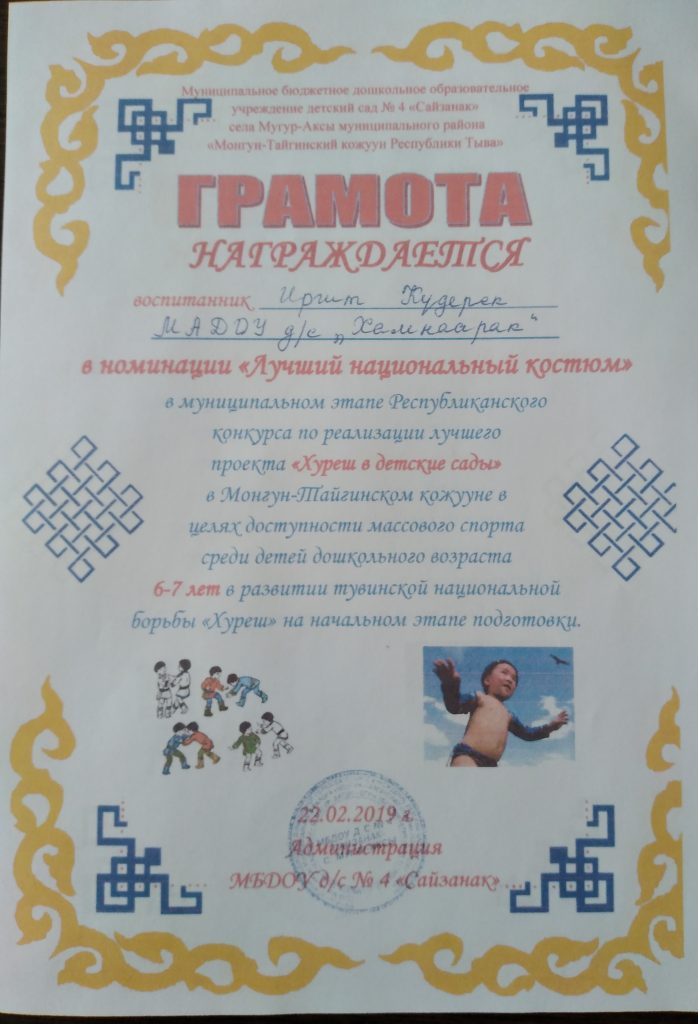 В рамках объявленному месячнику по реализации ведомственного проекта «Хуреш в детские сады» и честь празднования 77-летия Победы в Великой Отечественной войне проведен турнир по национальной борьбе Хуреш среди мальчиков (от 4-7лет) детских садов кожууна. Из нашего детского сада тоже приняли участие мальчики в возрасте 4-6 лет. В итоге Чимит Куулар занял 1 место среди мальчиков в возрасте 4-5 лет. Лучшие звания получили следующие борьцы: